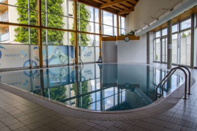 Přístup k bazénu je ze zadní části hotelu, naleznete POSLEDNI otevřené  dveře  v řadě zezadu , zde vstoupíte a sjedete výtahem o patro níže do – 1 patra. Zde uvidíte již vstup k bazénu. Na klikách uvidíte zavěšené karty, které je potřebné přiložit pro otevření dveří. K uzamčení skřínky je potřebné mít s sebou minci 10 Kč.